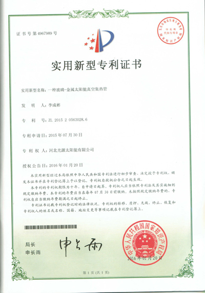 實(shí)用新型專利證書(shū)--一種玻璃-金屬太陽(yáng)能真空集熱管