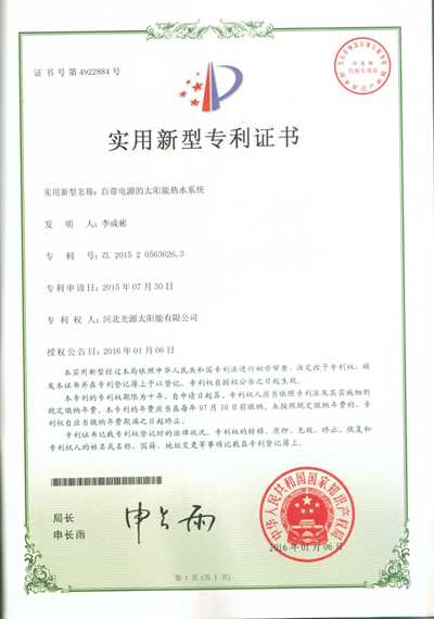 實(shí)用新型專利證書(shū)--自帶電源的太陽(yáng)能熱水系統(tǒng)