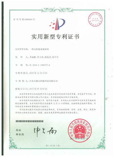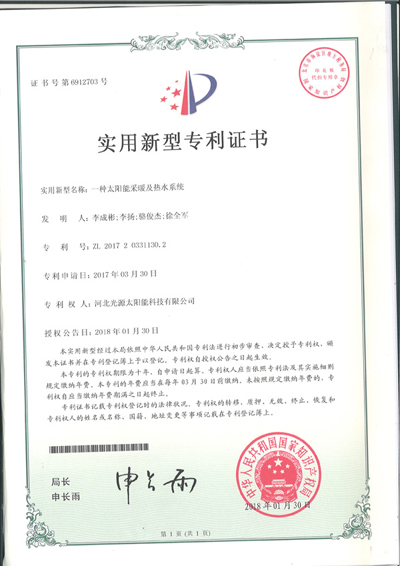 實(shí)用新型專利證書(shū)--一種太陽(yáng)能采暖系統(tǒng)