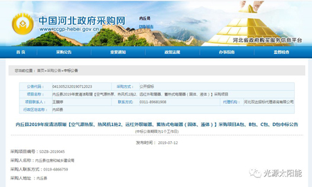 內(nèi)丘縣2019年度清潔取暖【空氣源熱泵、熱風(fēng)機(jī)1拖2、遠(yuǎn)紅外取暖器、蓄熱式電暖器(固體、液體)】采購(gòu)項(xiàng)目入圍項(xiàng)目中標(biāo)公告出爐,河北光源太陽能科技有限公司憑借強(qiáng)大的品牌實(shí)力、過硬的產(chǎn)品質(zhì)量以及親民的售后服務(wù)榮登榜單。入圍產(chǎn)品為:蓄熱式電暖器(液態(tài))。