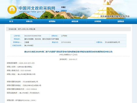 奮力拼搏創(chuàng)佳績,捷報頻傳奏凱歌。河北光源太陽能科技有限公司,在2019年09月27日,唐山市豐南區(qū)2019年第二批氣代煤燃氣壁掛爐及電代煤電取暖設(shè)備采購及安裝項目A標包第四標段中標,為我公司2019年度輝煌的經(jīng)營業(yè)績再添濃墨重彩的一筆。