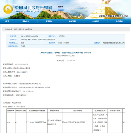 2020年巨鹿縣“電代煤”設(shè)備采購(gòu)供應(yīng)商入圍項(xiàng)目
