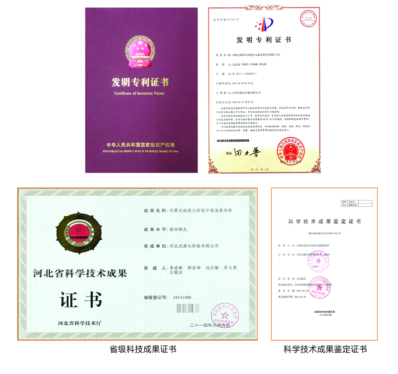 技術(shù)特點(diǎn):一是內(nèi)置CPC反射器。外罩玻璃管與吸熱管采用同軸套管,在真空管內(nèi)壁下半周設(shè)置金屬拋物面反射器,運(yùn)用拋物面原理實(shí)現(xiàn)了全角度采光,反射器不受大氣污染,聚光效果更好。二是耐高溫鍍膜技術(shù)。內(nèi)吸熱管表面濺射耐高溫太陽(yáng)吸收膜層,內(nèi)外管之間抽真空,工作溫度400℃以上膜層不脫落、不老化。三是強(qiáng)制傳質(zhì)傳熱技術(shù)。在吸熱管內(nèi)插裝金屬套管,套管內(nèi)置入金屬導(dǎo)熱管,使管內(nèi)的介質(zhì)容量減少了70%,大大提高了傳質(zhì)傳熱效率。四是安全承壓技術(shù)。金屬套管與聯(lián)集箱采用絲扣連接,保證系統(tǒng)工作安全可靠。經(jīng)權(quán)威機(jī)構(gòu)檢驗(yàn),太陽(yáng)能吸收比、熱損系數(shù)、真空品質(zhì)等技術(shù)指標(biāo)均優(yōu)于國(guó)家標(biāo)準(zhǔn)。采用該產(chǎn)品組成的太陽(yáng)能中高溫?zé)崂孟到y(tǒng),穩(wěn)定工作溫度可達(dá)到163℃蒸汽,真正實(shí)現(xiàn)了太陽(yáng)能由“熱水應(yīng)用”到“熱能應(yīng)用”的跨越式提升,填補(bǔ)了國(guó)內(nèi)太陽(yáng)能中高溫真空集熱管在160℃溫區(qū)的技術(shù)空白。科技成果鑒定認(rèn)為:該產(chǎn)品的綜合性能達(dá)到了“國(guó)內(nèi)領(lǐng)先水平”,系統(tǒng)可廣泛用于太陽(yáng)能飲用開(kāi)水、采暖制冷、食品加工、紡織印染、農(nóng)副產(chǎn)品烘干等多種行業(yè)。對(duì)促進(jìn)大氣污染治理,推動(dòng)我國(guó)能源結(jié)構(gòu)調(diào)整具有重要意義。