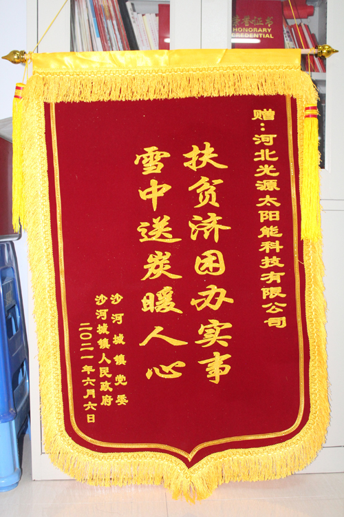 送人鮮花 留有余香 今天光源送給農(nóng)民壁掛爐,鎮(zhèn)黨委政府送來錦旗。錦旗上褒揚(yáng)光源的14個大字就是余香:“扶貧濟(jì)困辦實(shí)事,雪中送碳暖人心”。這余香是鼓勵也是激勵,是褒揚(yáng)也有希望。它鼓勵光源人要多做雪中送碳的人,激勵光源人多做扶貧濟(jì)困的事兒。光源人不會辜負(fù)這面錦旗。
